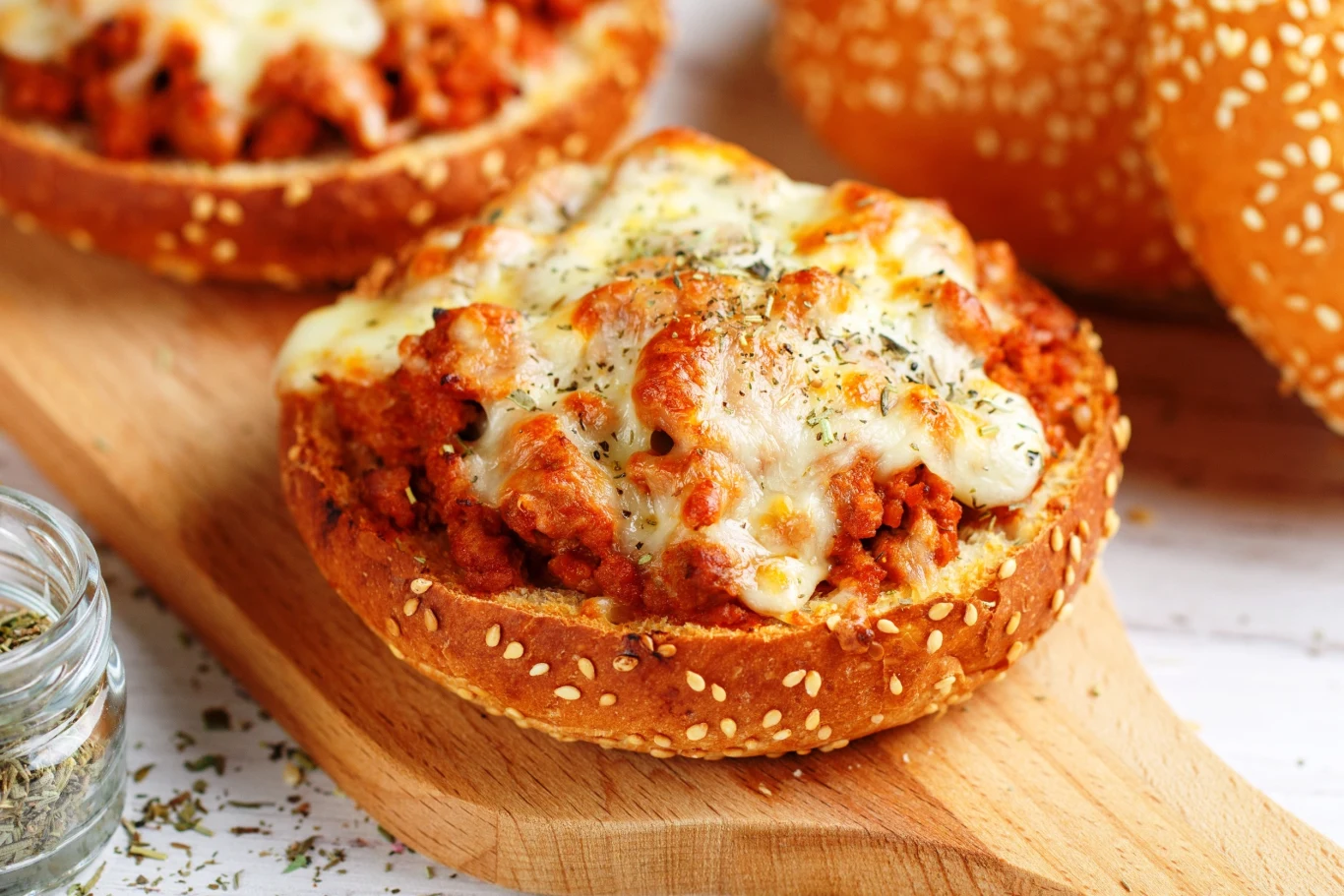 Wypełnij podpieczone bułki mięsem z patelni. Na każdej ułóż plaster sera. Oprósz oregano. Wstaw z powrotem do piekarnika. Zapiekaj, aż ser się roztopi.