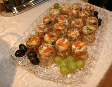 - Bierzemy głębokie miseczki lub specjalne naczynia do galertów. Umieszczamy w nich mięso oraz warzywa. Następnie zalewamy każdą porcję wcześniej odlanym wywarem. Przykrywamy naczynia i pozwalamy nóżkom się wystudzić.