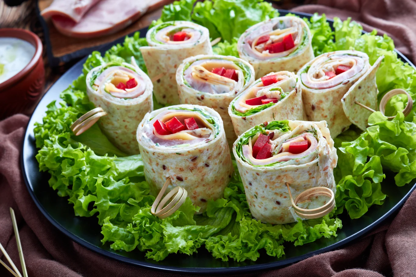 3. Na każdej tortilli kładź kolejno: liście sałaty, plastry szynki, plastry żółtego sera. Na środku ułóż słupki papryki i całość zwiń ciasno w roladkę.
