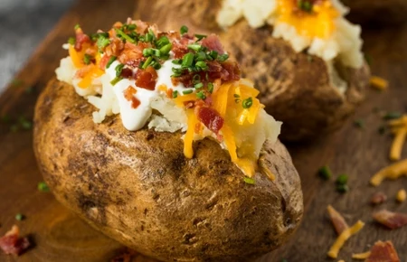 Tak przygotowany farsz przełóż z powrotem do wnętrza ziemniaków, ułóż je ponownie na blaszce do pieczenia. Posyp je startym serem cheddar i zapiekaj przez 5-7 minut w 200 stopniach. Ziemniaki po góralsku podawaj na ciepło, posypane resztą boczku i szczypioru.