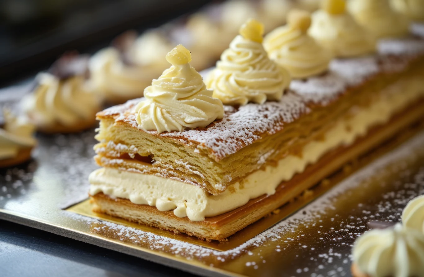 Pierwszą część wyłóż na pierwszy blat ciasta francuskiego. Przykryj drugim blatem. Na wierzch rozsmaruj drugą część kremu (możesz użyć rękawa cukierniczego dla dekoracji).