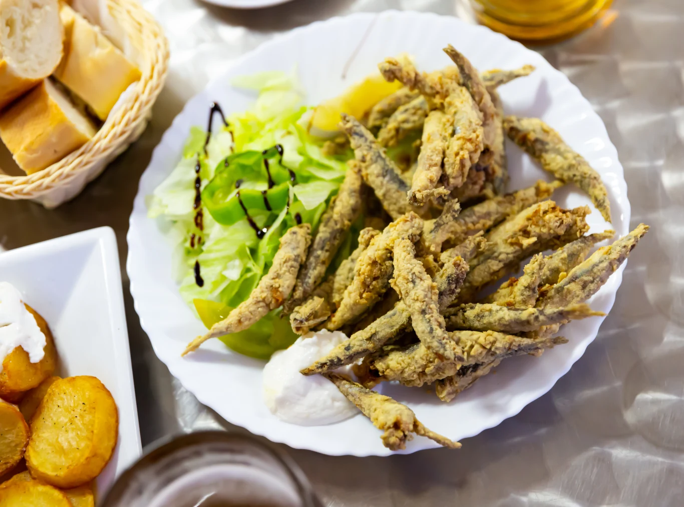 - Rozgrzej olej na patelni do temperatury 170-180°C. Wrzucaj rybki partiami, smaż przez 2-3 minuty, aż nabiorą złotego koloru. Alternatywnie możesz rozłożyć ryby pojedynczą warstwą na blasze wyłożonej papierem do pieczenia, skropionej oliwą, a potem upiec je w piekarniku w temperaturze 200°C przez około 12-15 minut
