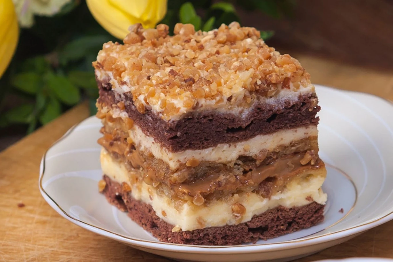 Czasami brakuje ochoty na przygotowanie skomplikowanych deserów, nawet jeśli zrobiłyby największe wrażenie na gościach. Ciasto Pani Nowak to bardzo prosta, ale wciąż przepyszna, wersja popularnego snickersa. Wykorzystuje podobne składniki, więc prawie identycznie smakuje. W tym wydaniu łączymy miękki kakaowy biszkopt, masę budyniową i kajmak połączony z orzechami. Wychodzi doskonały, słodki wypiek.