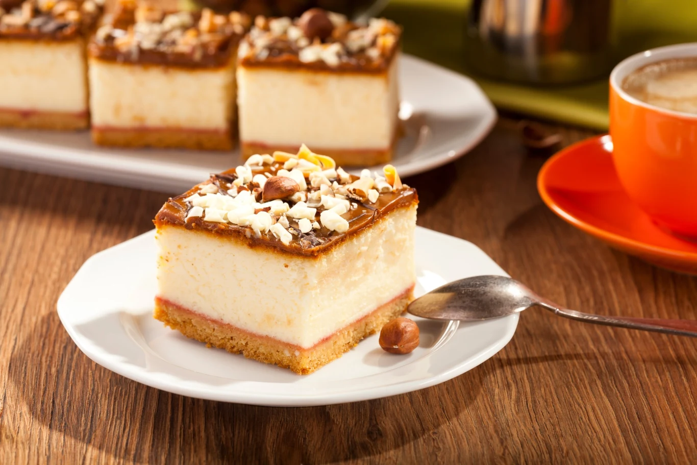 Pokrusz czekoladę i roztop w rondelku wraz z masą krówkową. Wymieszaj. Rozprowadź lekko przestudzoną polewę na serniku. Oprósz orzechami. Odstaw na noc w chłodne miejsce.