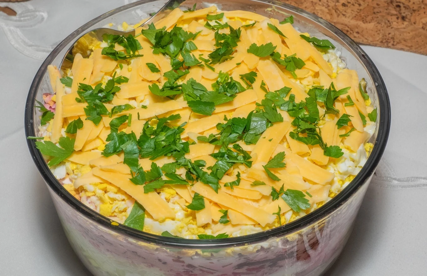 Wierzch posyp serem i udekoruj posiekaną natką pietruszki. Wstaw miskę na kilka godzin do lodówki (najlepiej na całą noc), aby smaki się przegryzły. Sałatkę z żółtym serem podawaj schłodzoną.