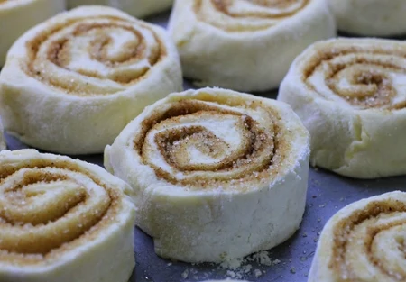 Zwiń ciasto w roladę wzdłuż dłuższego boku. Dociśnij mocno łączenie. Ostrym nożem potnij je na kawałki o grubości ok. 4 cm. Odkładaj je na blachę wyłożoną papierem do pieczenia i przykryj ściereczką kuchenną na ok. 2 godziny, do podwojenia objętości.