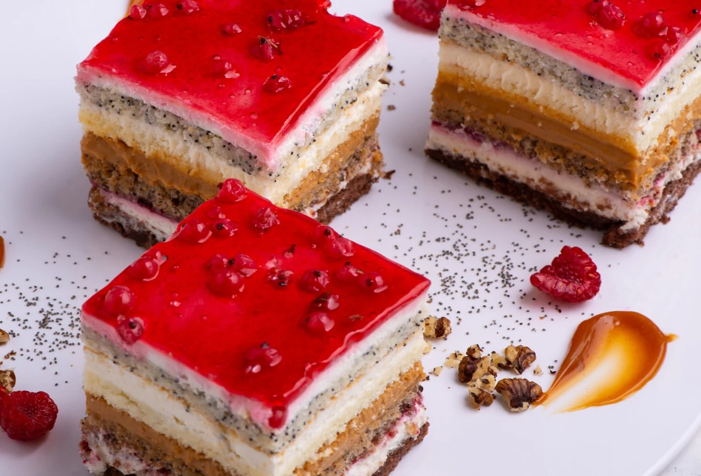 Połowę masy serowej wyłóż na pierwszy spód biszkoptu. Przykryj herbatnikami, a na to wyłóż masę kajmakową i kolejną warstwę herbatników. Na to wyłóż kolejną część masy serowej i przykryj drugim spodem biszkoptu. Galaretki rozpuść w gorącej wodzie i odstaw do wystudzenia. Gdy zacznie lekko tężeć, wylej ją na wierzch ciasta, a następnie dodaj czerwoną porzeczkę. Wstaw ciasto na całą noc do lodówki do schłodzenia.