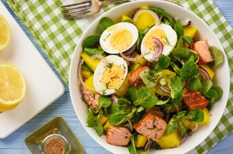 Piekę łososia, gotuję ziemniaki i jajka. Ta sałatka to witaminowa bomba, pomaga schudnąć