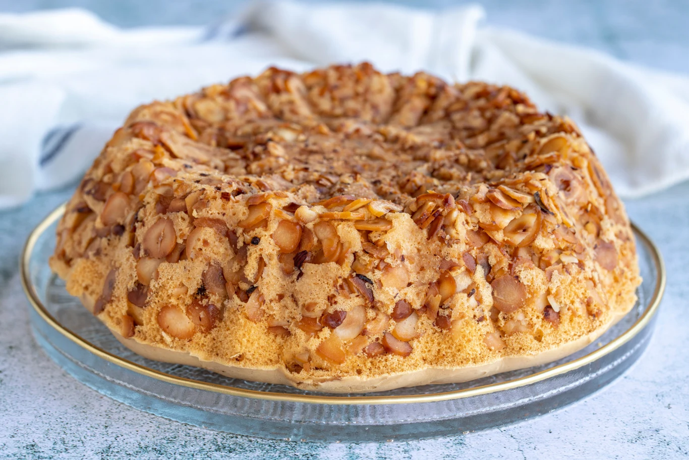 4. Od razu po wyjęciu z piekarnika odwróć ciasto na talerz lub kratkę, tak aby masa orzechowa znalazła się na górze.