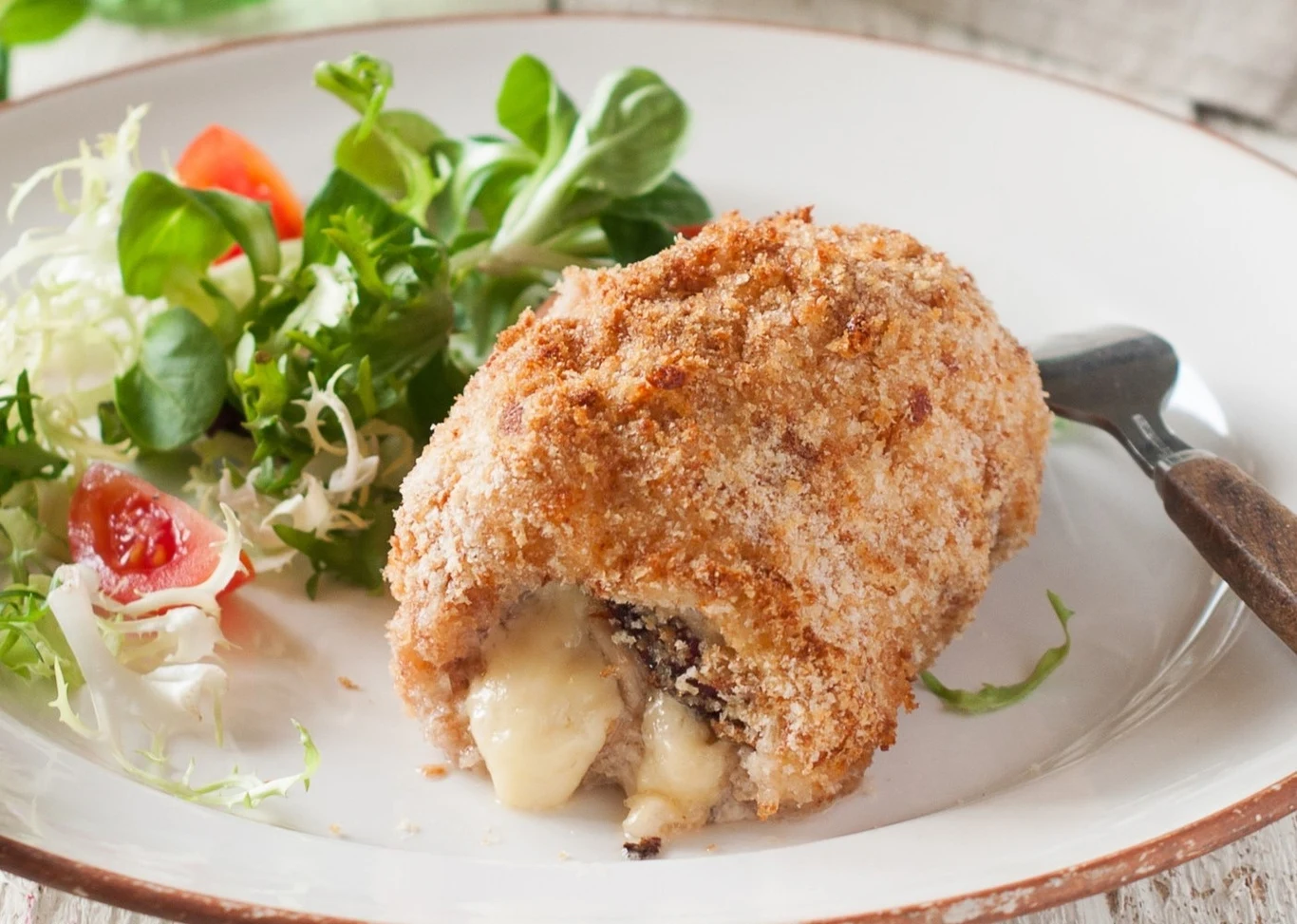 Mozzarellę pokrój w cienkie słupki i włóż ją do wewnątrz razem z boczkiem. Pierś zamknij i następnie delikatnie oprósz mąką.