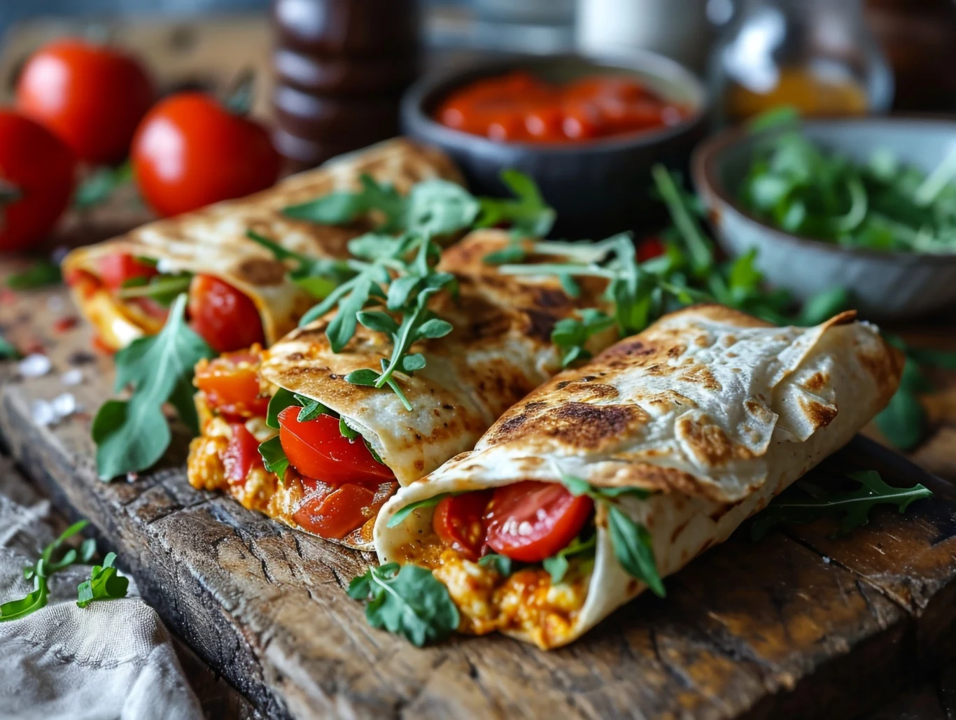 Na każdą z tortilli nałóż porcję sosu i trochę rukoli. Zawiń w rulon. Podawaj gorące.