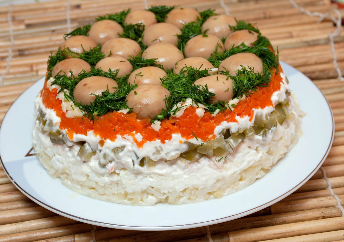 Ta sałatka bazuje nie tylko na warzywach, ale też na mięsie. Kurczak stanowi w niej jedną z warstw i odpowiada za wartość odżywczą dania, które lepiej syci i wspaniale smakuje. Z tego względu polecam ci ją nie tylko na Wielkanoc, ale też na inne uroczystości oraz okazje. Zwłaszcza że przygotowanie jest naprawdę proste i bazuje na produktach znanych oraz lubianych przez polskie rodziny. Najmocniejszym akcentem jest tutaj wierzchnia warstwa, na którą składają się pieczarki i koperek. Połączenia pomiędzy poszczególnymi piętrami są spoiste, aksamitne za sprawą majonezu - sos sprawia też, że cała kompozycja trzyma się i zachowuje formę.