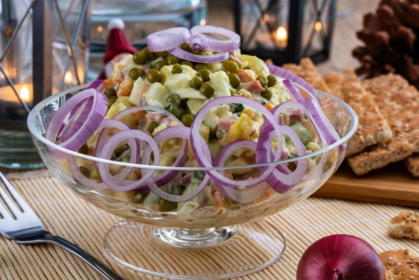 W tej wersji bazą są ugotowane ziemniaki i jajka, które wpływają na sytość dania i dobrze wpisują się w wielkanocny klimat. Do tego dochodzi szynka, kukurydza, groszek, ser żółty i chrupiące ogórki konserwowe. Sos jest delikatny, ale wyrazisty, bo opiera się na majonezie, jogurcie naturalnym i odrobinie musztardy. Całość wieńczy drobno posiekany szczypiorek.