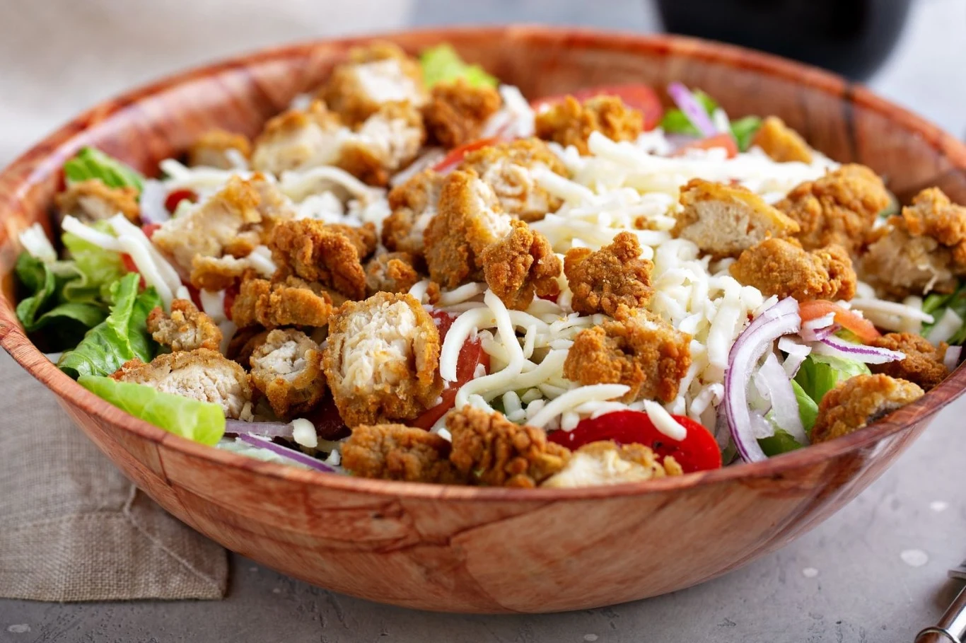 Choć lista składników do przygotowania tej luksusowej sałatki nie jest krótka, to przyrządza się ją prosto. Przekąska to połączenie warzyw (w tym chrupiącej sałaty rzymskiej, pomidorków, cebuli i papryki), sera mozzarella oraz chrupiącego kurczaka w panierce.