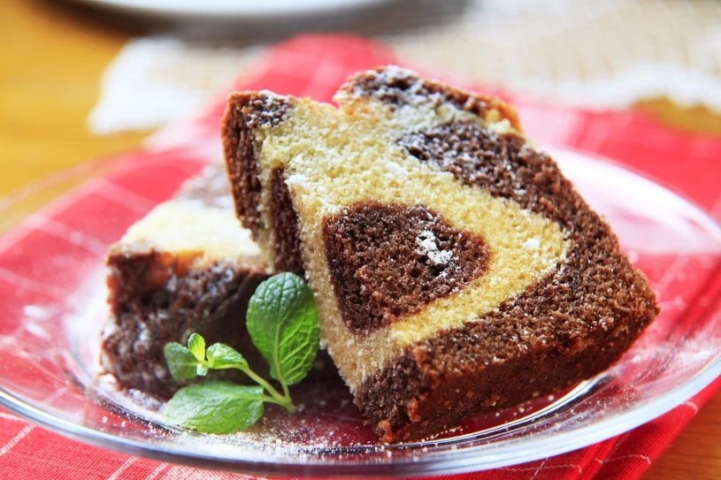Przygotuj keksówkę (26 cm) i posmaruj ją tłuszczem. Na spód wylej ciemne ciasto, zostawiając 1-2 łyżki. Następnie wlej jasną część, równomiernie rozprowadzając. Na samym środku, na całej długości, zrób wąski wałeczek z pozostałego ciemnego ciasta.