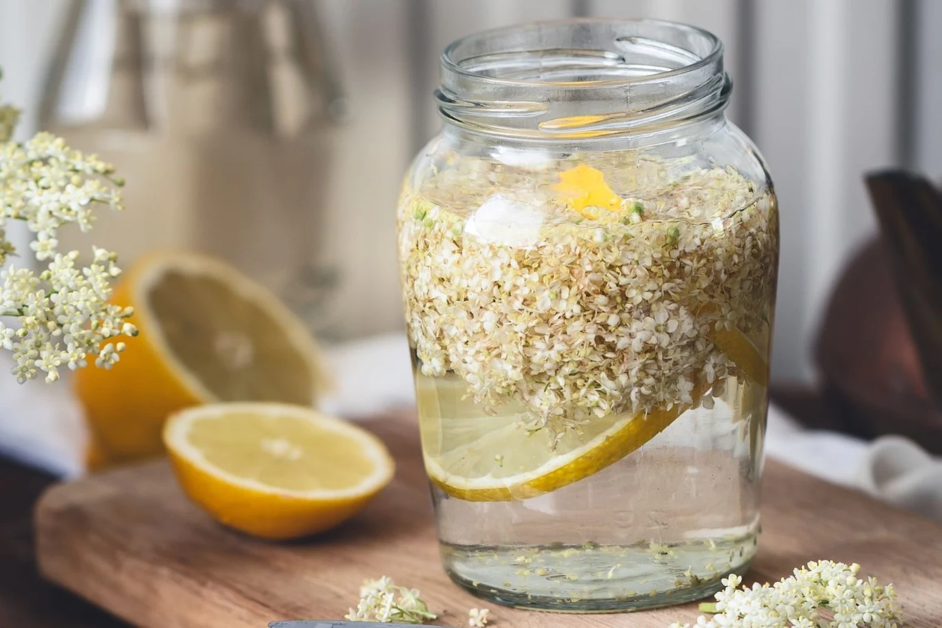 Cytryny przeparz i dokładnie umyj. Pokrój na plastry. Oczyszczone kwiaty czarnego bzu układaj w wyparzonym słoju naprzemiennie z plastrami cytryny.