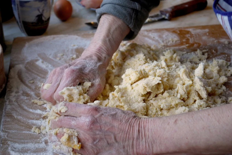 - Zaczynamy od przesiania obu rodzajów mąki na blat lub do misy. Dodajemy sól, cukier i cukier wanilinowy. Następnie kruszymy kawałki zimnego masła i smalcu, po czym całość siekamy, aż masa zacznie przypominać gruboziarnisty piasek.