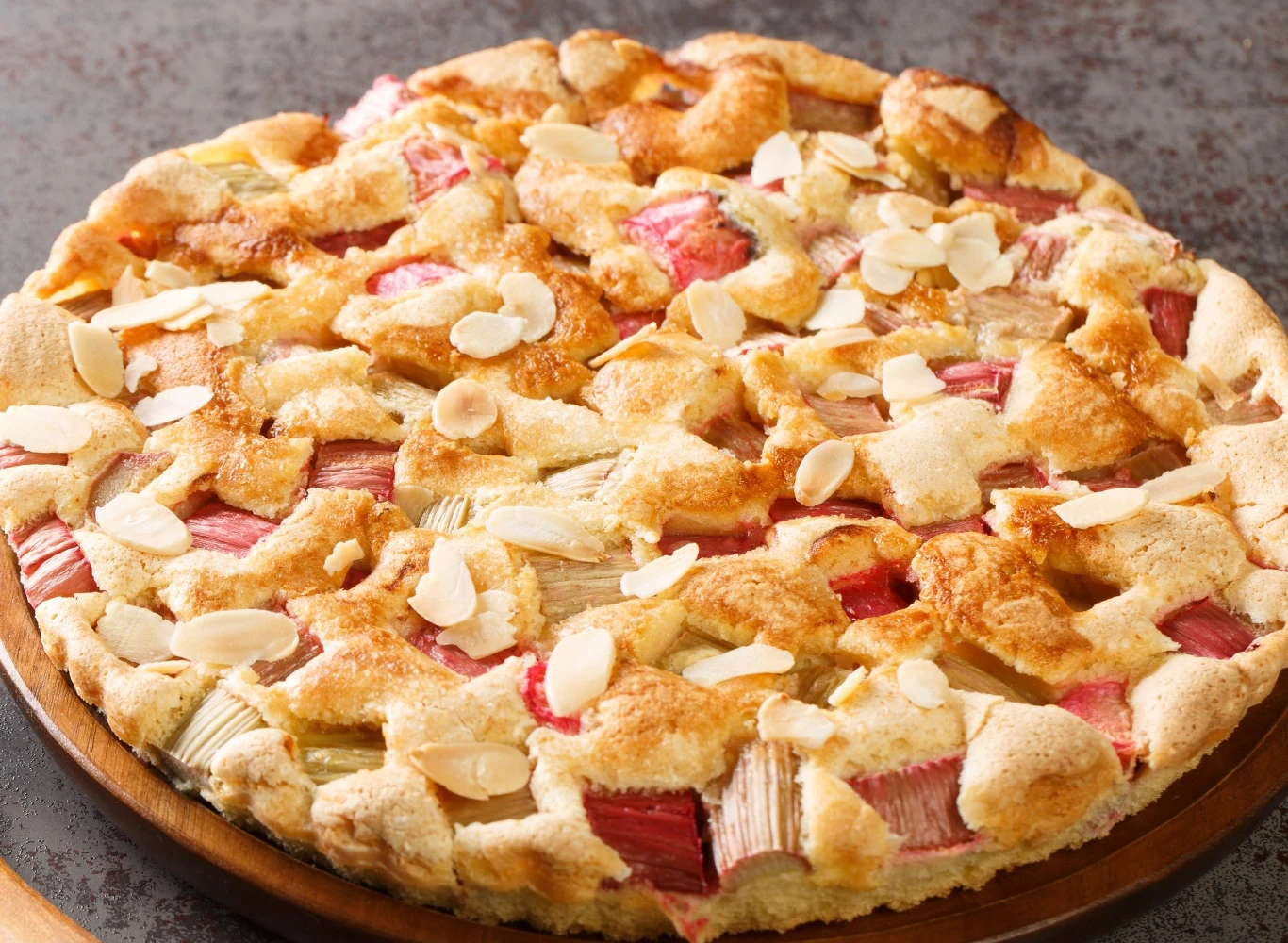 Przelej ciasto do formy. Na wierzchu rozłóż równomiernie rabarbar. Oprósz ciasto płatkami migdałów.