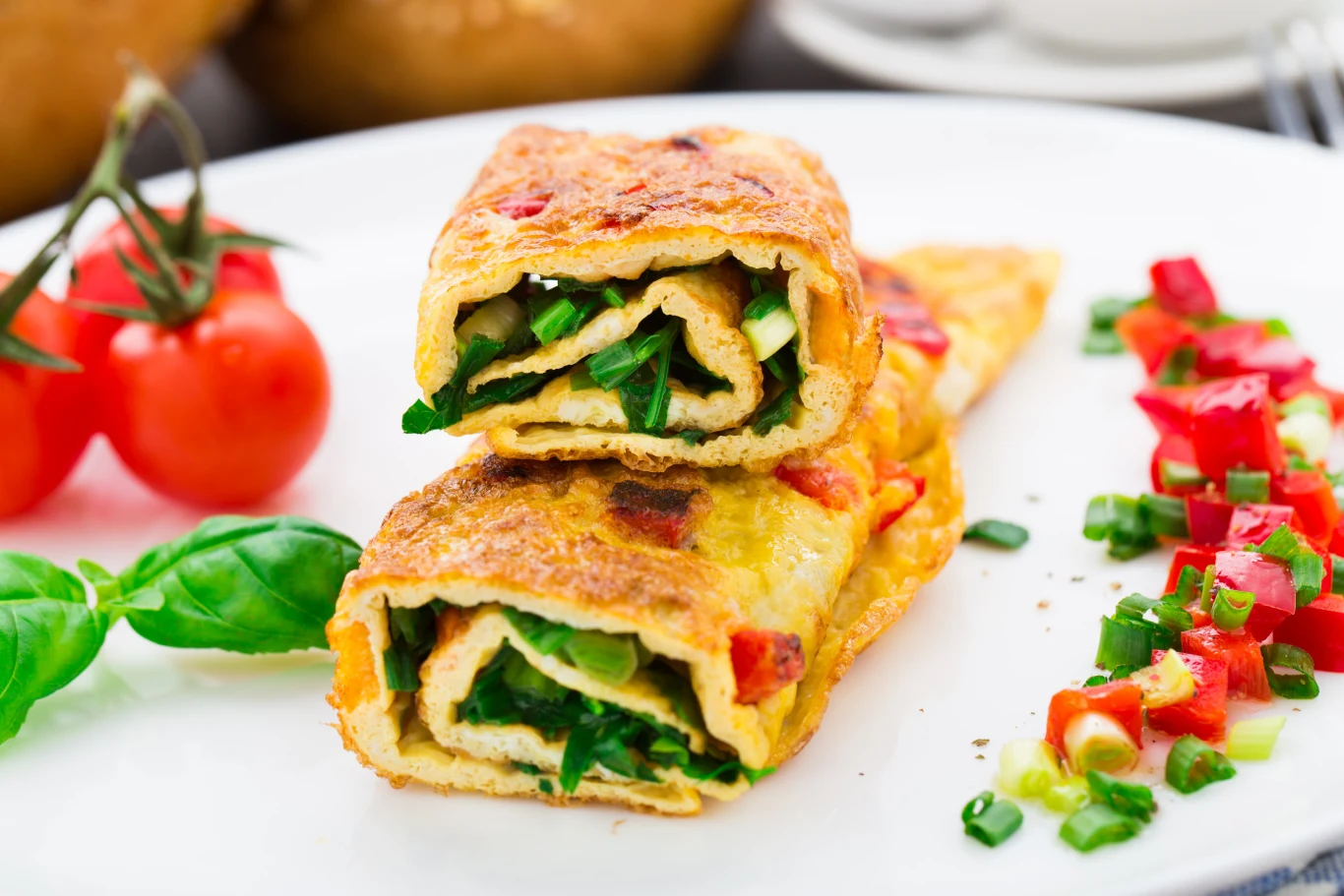 Takie śniadanie doskonale syci, ale nie dostarcza pustych kalorii. Jeżeli chcesz rozpocząć dzień od wartościowego, a jednocześnie pysznego posiłku, ta rolada omletowa z pomidorami sprawdzi się doskonale. Możesz także wziąć ją do pracy czy zjeść później, na przykład na kolację.