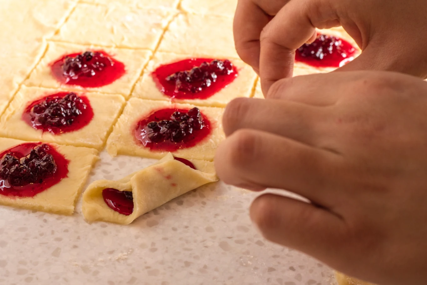 Gotowe ciasto podziel na 2 części. Pierwszą część przełóż na podsypaną mąką stolnicę i cienko rozwałkuj (podobnie jak na pierogi). Pokrój na kwadraty o długości 5-7 cm za pomocą ostrego noża lub radełka. Na środku każdego kwadratu połóż łyżeczkę dżemu i zawiń naprzeciwległe rogi do środka.