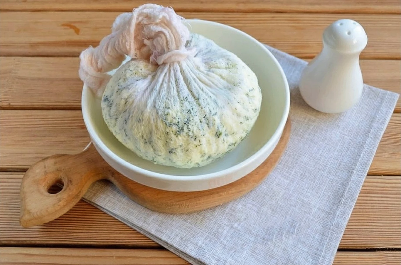 - W osobnej misce umieść sitko i wyłóż je kilkoma warstwami gazy. Wlej jogurt z dodatkami do sitka. Skręć końce gazy, aż jogurt będzie dobrze przykryty i lekko ściśnięty.