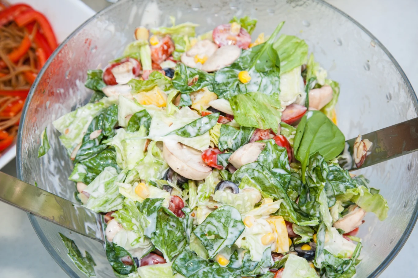 Sałatę porwij i umieść razem z umytymi liśćmi szpinaku w misce sałatkowej. Pieczarki obierz i dobrze oczyść. Pokrój je w dość grube plastry. Dodaj je do miski. Grzyby można spożywać na surowo, ale jeśli chcesz, możesz lekko podsmażyć je na suchej patelni. Paprykę oczyść z gniazda nasiennego i pokrój ją w kostkę. Dodaj do reszty. Pomidory pokrój w małą kostkę i dodaj do reszty do reszty składników. Dołóż odcedzoną kukurydzę i pokrojone w cienkie plasterki oliwki.