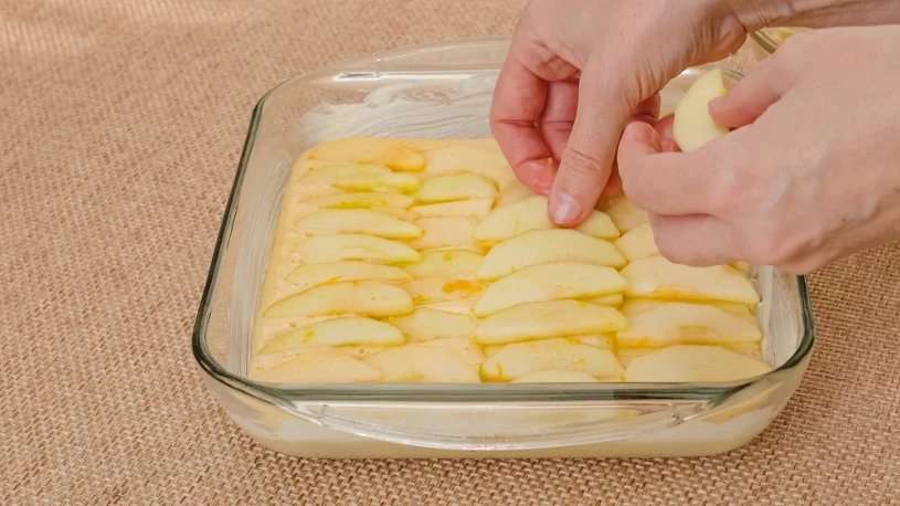 Natłuść dno formy o wymiarach np. 18 x 27 cm. Przełóż do formy ciasto i wyrównaj jego powierzchnię. Na powierzchni ciasta rozłóż równomiernie pokrojone jabłka. Delikatnie wciśnij je w głąb ciasta.