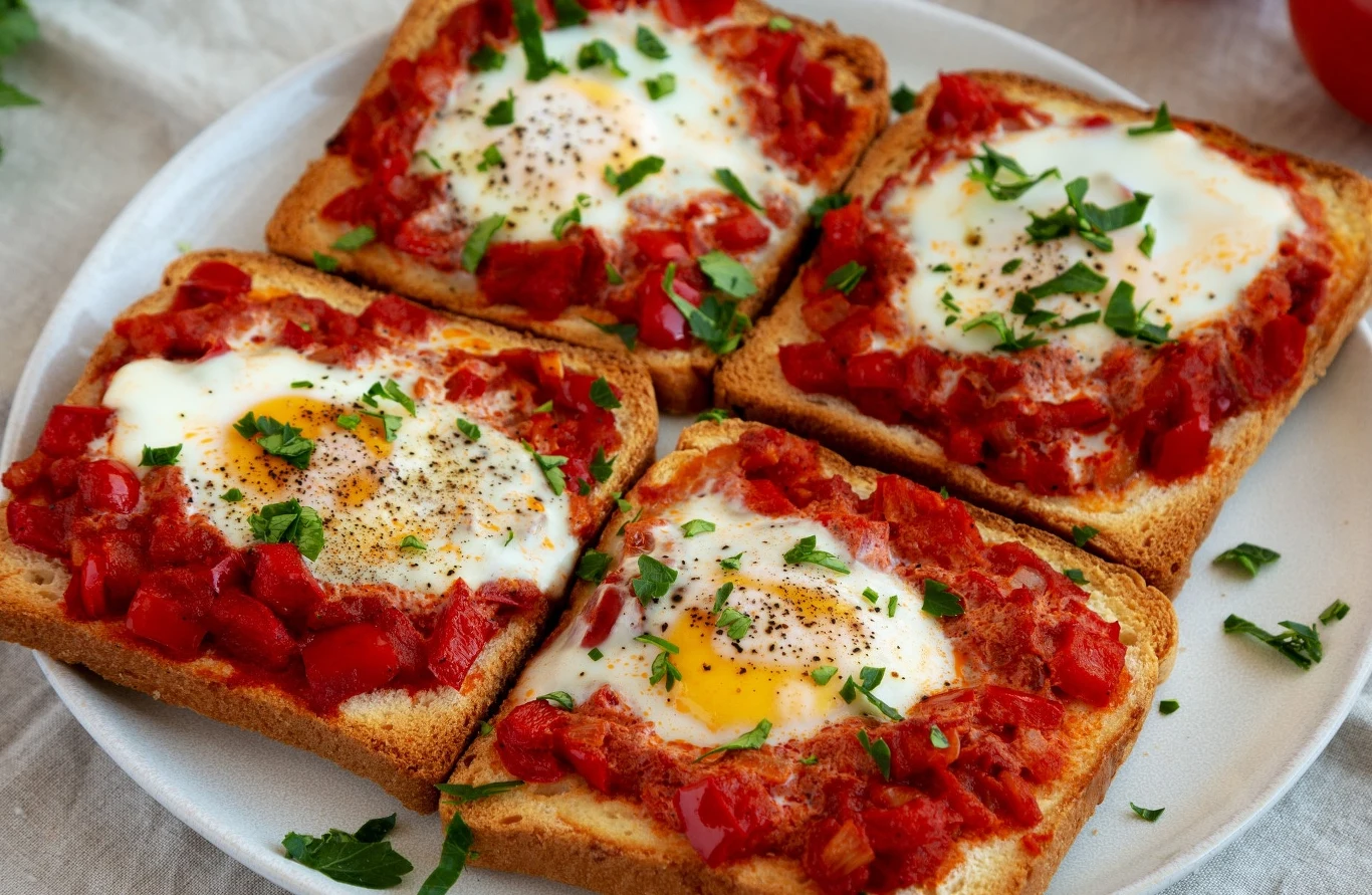Na środku każdego tostu zrób łyżką wgłębienie w warstwie warzyw. Wbij w nie surowe jajko, uważając, by nie uszkodzić żółtka. Jajka dopraw solą i pieprzem. Wstaw tosty z powrotem do piekarnika. Piecz przez 20 minut. Podawaj gorące, oprószone posiekaną natką pietruszki.