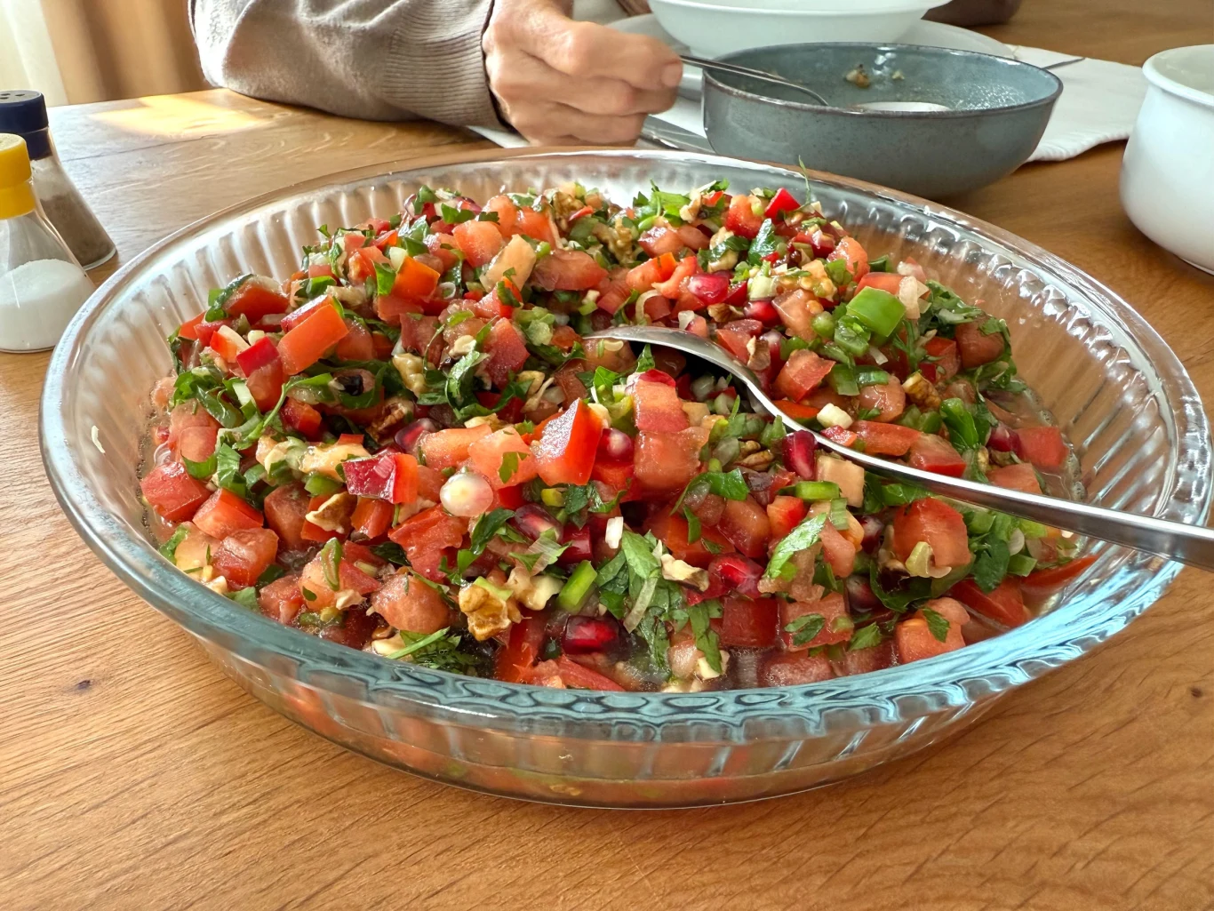 Gavurdagi to klasyczna sałatka z kuchni tureckiej - soczyste pomidory, chrupiące orzechy, świeże warzywa i wyjątkowy sos z syropem z granatu oraz sumakiem. Idealna jako przystawka, lekka kolacja lub dodatek do dań z grilla. W tej wersji proponujemy dodać jeszcze czerwoną paprykę i świeży szczypiorek oraz natkę pietruszki. Doskonale podkreślają smak sałatki gavurdagi.