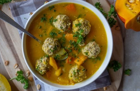 Zupę dyniową z pulpecikami podawaj na ciepło, od razu po przygotowaniu.