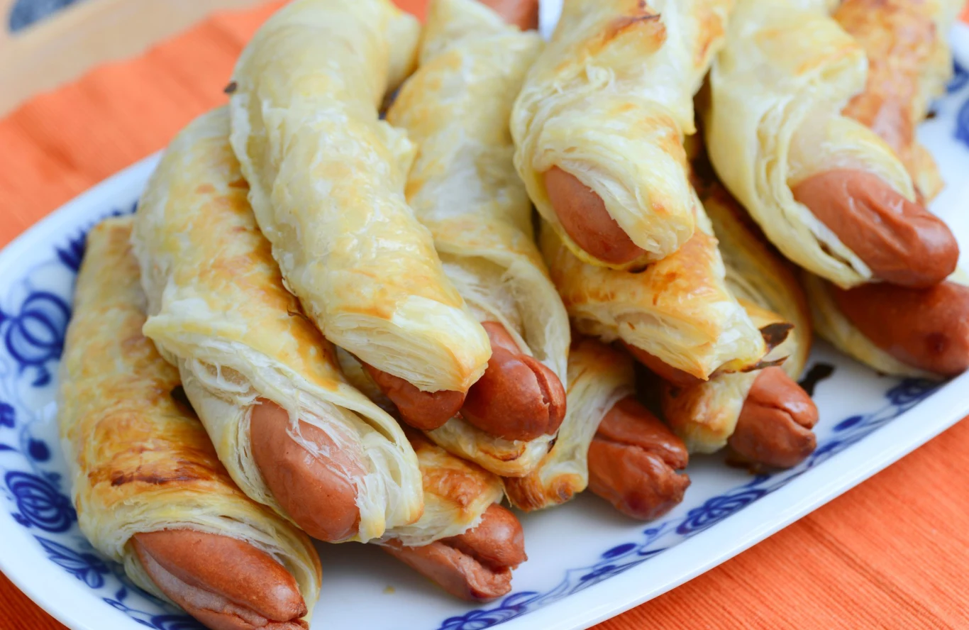 Parówki w cieście francuskim to jeden z najprostszych pomysłów na ciepłą kolację. Nie są może wykwintne, ale świetnie sprawdzą się jako przekąska podczas nieformalnych imprez, np. zabawy sylwestrowej w gronie przyjaciół. Pamiętaj jedynie, aby wybrać dobrej jakości parówki z dużą ilością mięsa. Do przygotowania dania według niniejszego przepisu potrzebujesz arkusza ciasta XXL o wymiarach 25x50 cm. Jeśli planujesz przekąskę dla większej liczby gości, odpowiednio pomnóż liczbę składników.