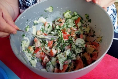 5. Dodaj jogurt grecki, dopraw solą i pieprzem, a następnie delikatnie wymieszaj, aby sos równomiernie pokrył warzywa.