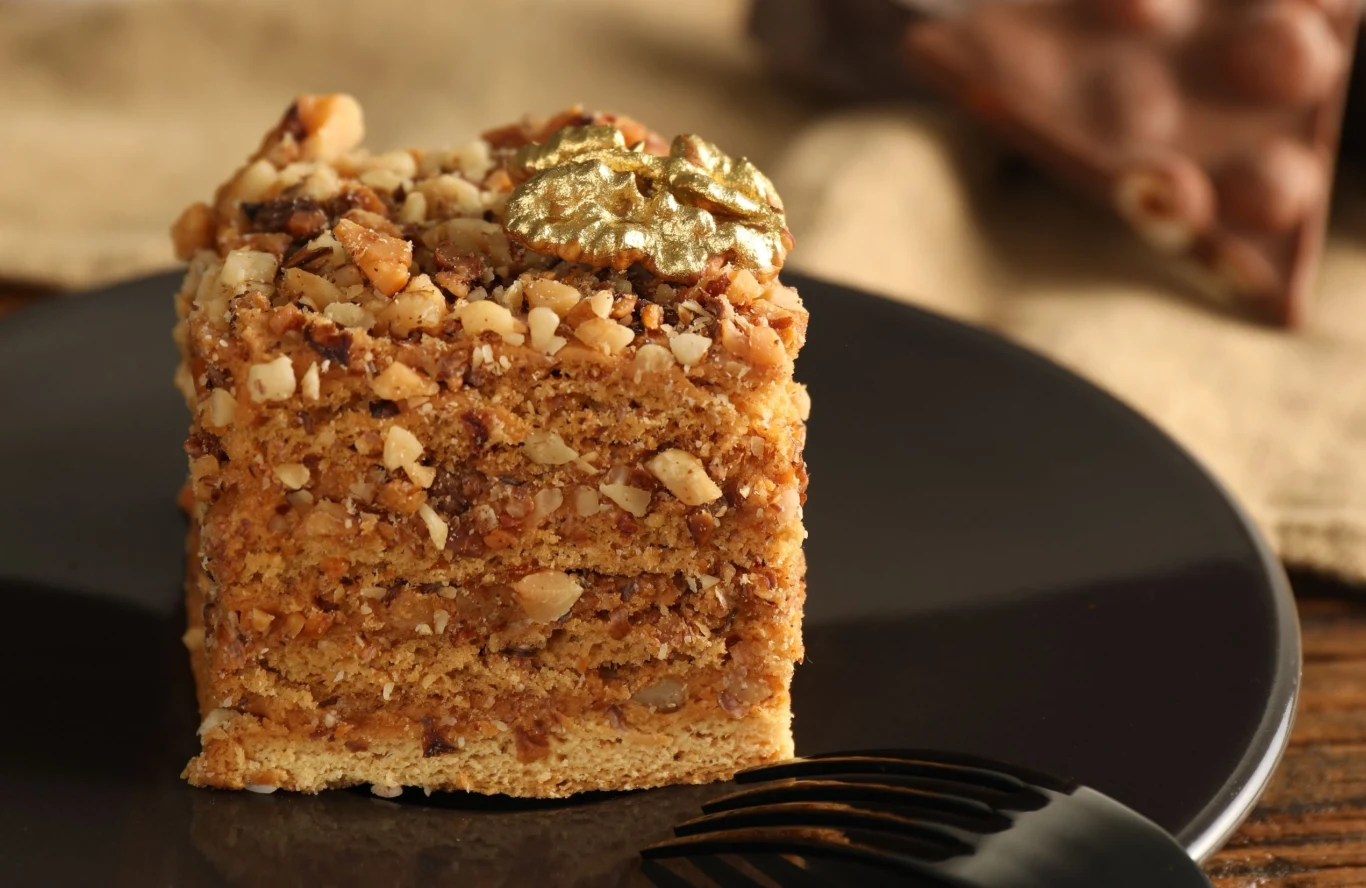 Ostatnią warstwę kremu udekoruj odłożonymi wcześniej orzechami. Całość wstaw na godzinę do lodówki.