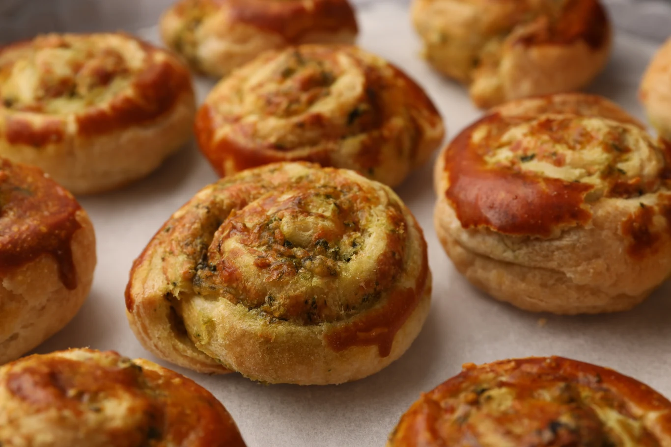 Ułóż rollsy na blasze wyłożonej papierem do pieczenia i posmaruj wierzch każdej bułki resztą mieszanki oliwno-parmezanowej.
