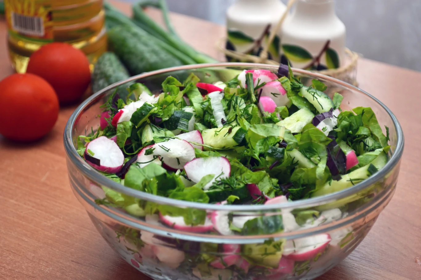 Sałatka Witaminka to prawdziwa skarbnica witamin, która zachwyca nie tylko świeżością i lekkością, ale także bogactwem wartości odżywczych. Dzięki obecności sałaty masłowej, roszponki, ogórka, rzodkiewki i koperku, dostarcza organizmowi cennych witamin - zwłaszcza A, C, K oraz witamin z grupy B - i minerałów, takich jak potas, magnez czy żelazo. Warzywa te wspierają odporność, poprawiają kondycję skóry, włosów i paznokci oraz regulują procesy trawienne. Dodatek oliwy z oliwek dostarcza zdrowych tłuszczów, korzystnie wpływających na układ sercowo-naczyniowy. Sałatka Witaminka to idealny wybór na lekki lunch, dodatek do obiadu lub zdrową przekąskę. Świetnie sprawdzi się jako posiłek dla osób dbających o linię, wegetarian oraz wszystkich, którzy pragną wzbogacić swoją dietę o świeże i naturalne składniki.