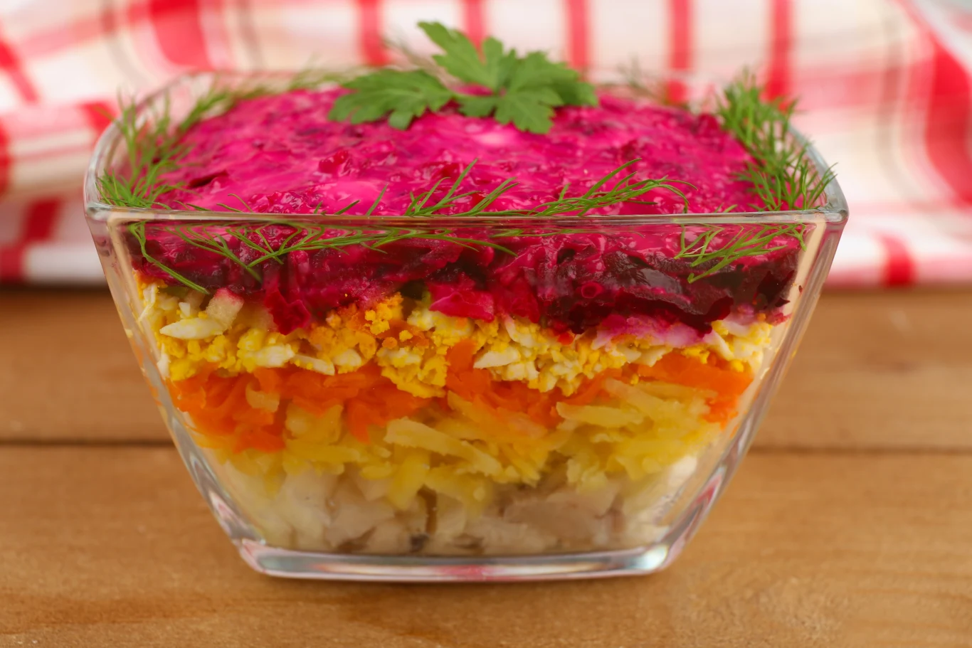 Złóż sałatkę w całość. Ułóż śledzie z cebulą na dnie szklanego naczynia. Posmaruj majonezem. Na wierzchu ułóż warstwę ziemniaków. Oprósz je solą i pieprzem. Posmaruj majonezem. Postępuj w taki sam sposób z kolejnymi warstwami sałatki – marchewkową, jajeczną i buraczaną. Całość udekoruj posiekaną zieleniną. Schłodź w lodówce.