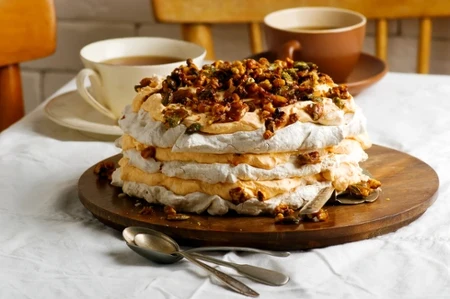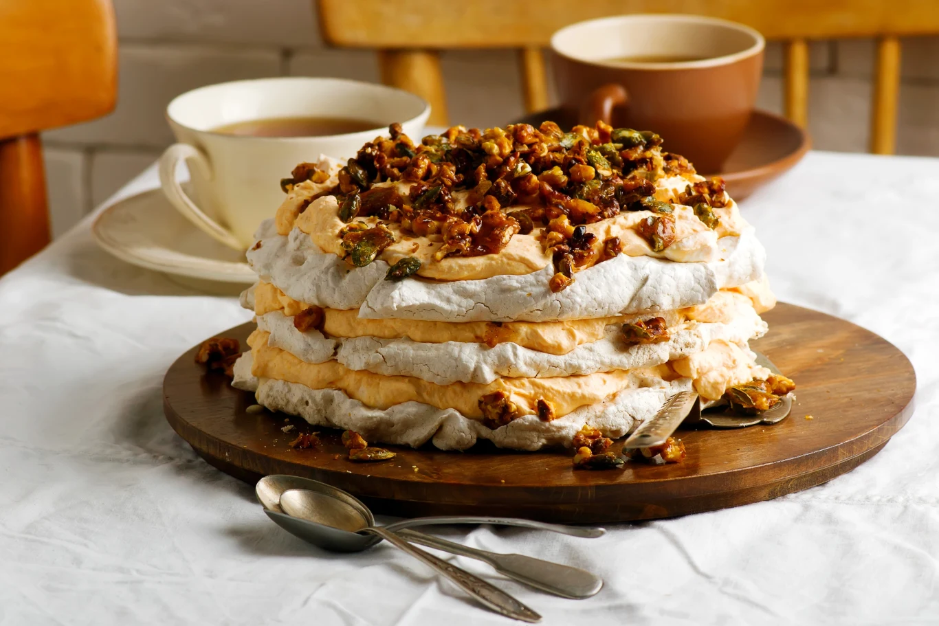 Dyniowa pavlowa to wyjątkowe połączenie chrupiącej bezy, lekkiego i aksamitnego kremu z nutą pomarańczy oraz aromatycznej dyni. Orzechy i krem laskowy nadają całości charakteru oraz przyjemnej chrupkości. Taki deser idealnie sprawdzi się na wszelkie specjalne okazje, goście na pewno będą pod wrażeniem.