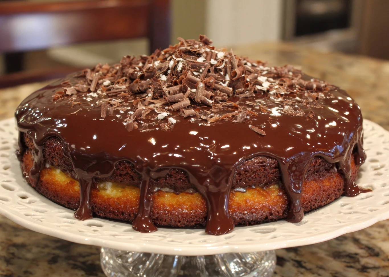 Na wierzchu wylej polewę czekoladową tak, by spłynęła po bokach. Posyp wierzch wiórkami czekoladowymi.