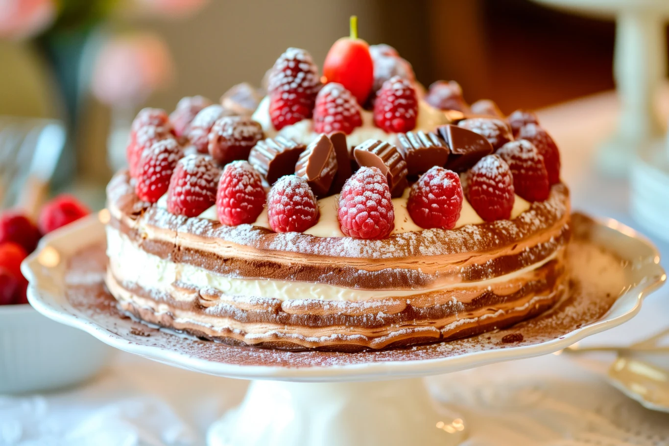 Torcik a la karpatka udekoruj świeżymi malinami i kawałkami czekolady. Podawaj na zimno, po schłodzeniu przez 2-3 godziny.