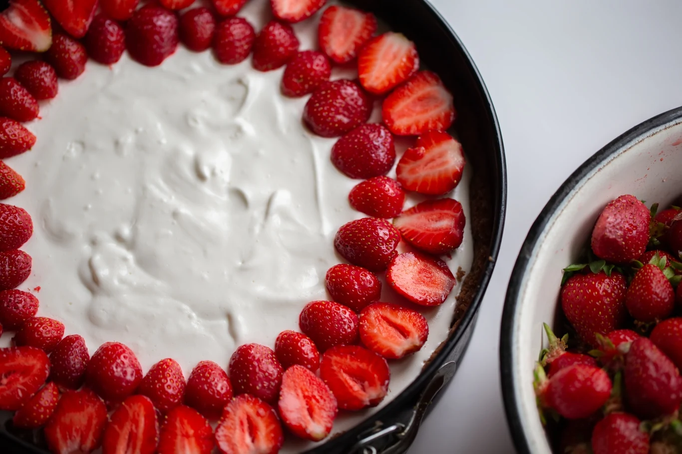 Oczywiście głównym składnikiem są w tym przypadku truskawki. Wybierając owoce w sklepie lub warzywniaku, warto postawić na te intensywnie czerwone, bez widocznych przebarwień - świadczących o ich przejrzałości. Do sernika na zimno dobrze jest użyć słodkich odmian, takich jak Alba, Lambada czy Honeoye.