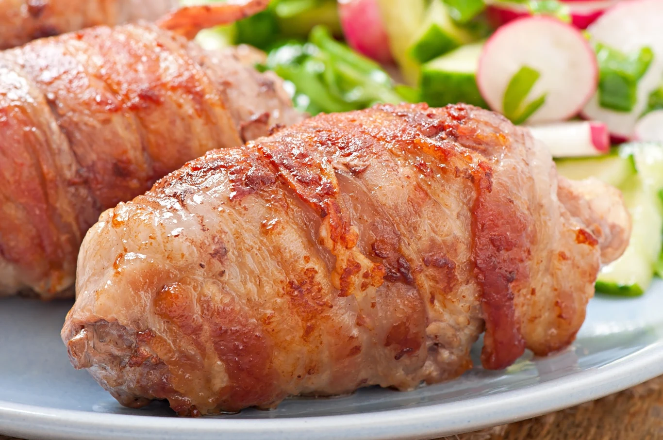 Zamarynowane mięso owiń szczelnie plastrami boczku. Możesz dodatkowo spiąć filety wykałaczkami, by boczek nie rozwinął się w czasie grillowania.