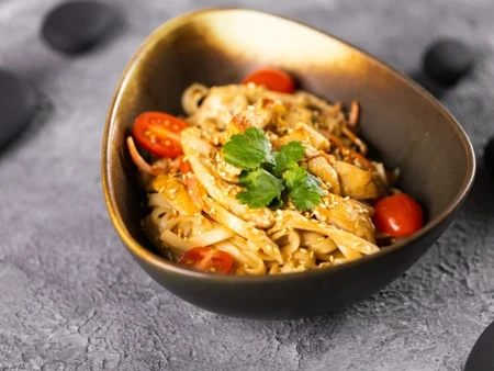 Wrzuć ugotowany makaron i podsmażonego kurczaka. Wymieszaj, podgrzej przez około dwie minuty. Na koniec dodaj sok z limonki/cytryny dla podbicia smaku.