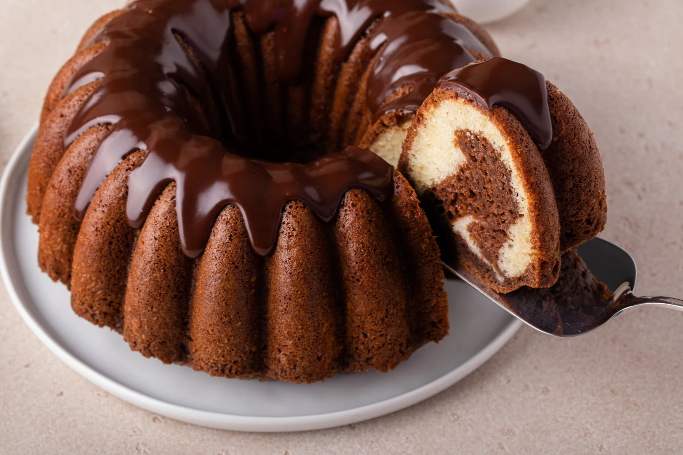 Natłuść i oprósz mąką formę do babki o średnicy 24 cm. Przelej do niej część masy czekoladowej. Na nią wylej część masy waniliowej, a następnie znów czekoladową, waniliową... do wyczerpania ciasta. Przejedź wokół formy, przez środek ciasta, zanurzonym w nim do połowy nożem.