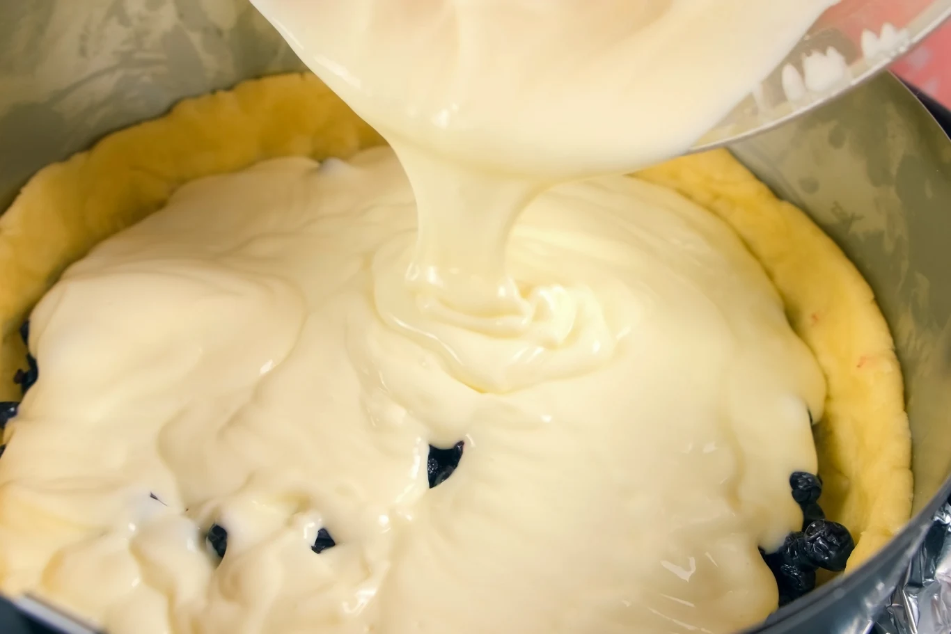 - Na spód dodaję borówki i wylewam masę budyniową.