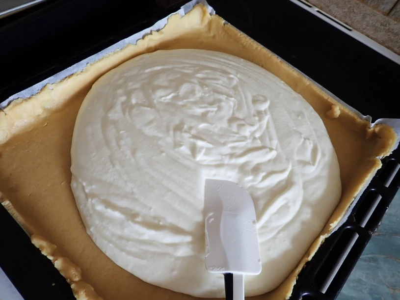 Warstwę serową wylej na spód i wygładź powierzchnię. Wstaw do piekarnika rozgrzanego do 180 st. Celsjusza na ok. 60 minut. Środek sernika powinien lekko drgać.