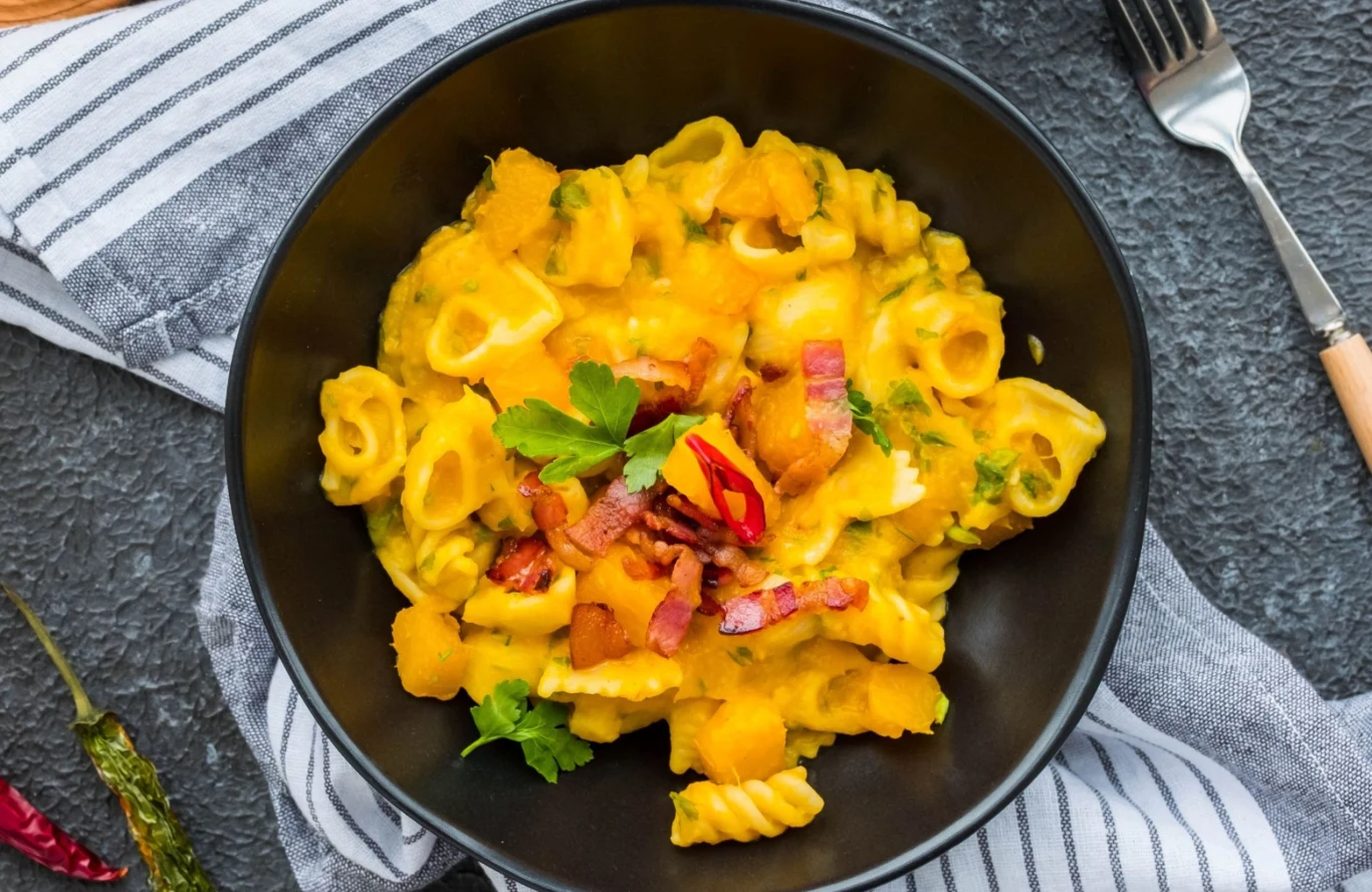 W przepisie na krem do makaronu w roli głównej występuje przede wszystkim pieczona dynia. Warzywo to zawiera sporo błonnika pokarmowego, który świetnie wpływa na trawienie, pomaga regulować pracę jelit, przyspiesza przemianę materii oraz wpływa na sytość po posiłku. Dodatkowo dynia jest niskokaloryczna, w 100 g ma tylko 26 kcal, dlatego będzie dobrym wyborem dla osób, które chcą kontrolować swoją masę ciała.