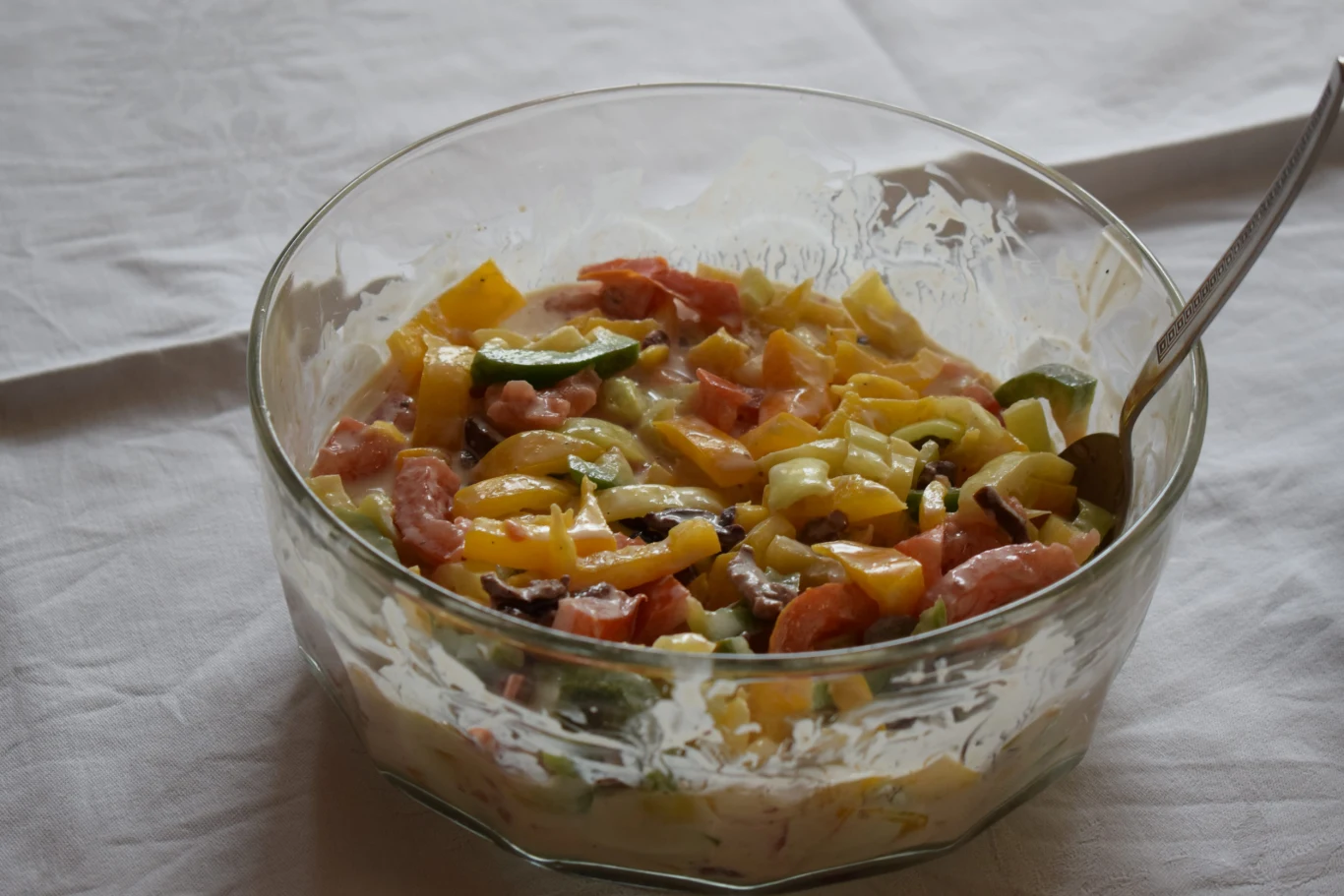 - Wszystkie warzywa włóż do szklanej misy i wstępnie wymieszaj.