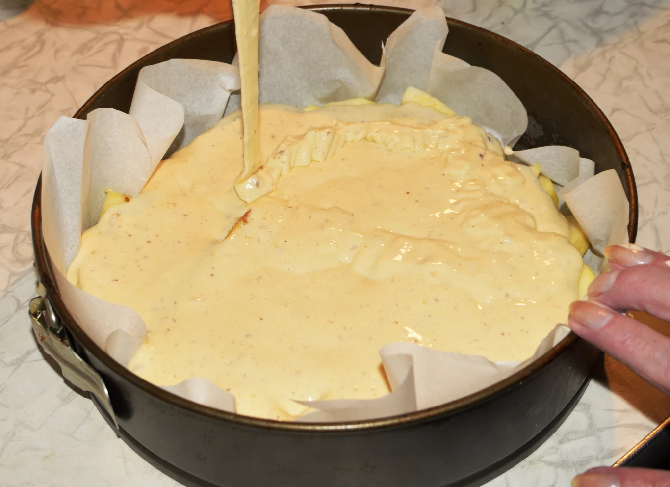 Wyjmij ciasto z lodówki. Tortownicę o średnicy ok. 30 cm wyłóż papierem do pieczenia. Jeśli ciasto jest elastyczne, odrywaj kawałki i wyklej nim spód formy. Jeśli zrobiło się twarde, możesz je zetrzeć na tarce o dużych oczkach i lekko dociskać palcami, aby połączyło się w formie. Włóż do piekarnika rozgrzanego do 180 stopni Celsjusza (w trybie góra-dół) i piecz ok. 20 minut, aż lekko się zarumieni. Nie wyłączaj piekarnika.