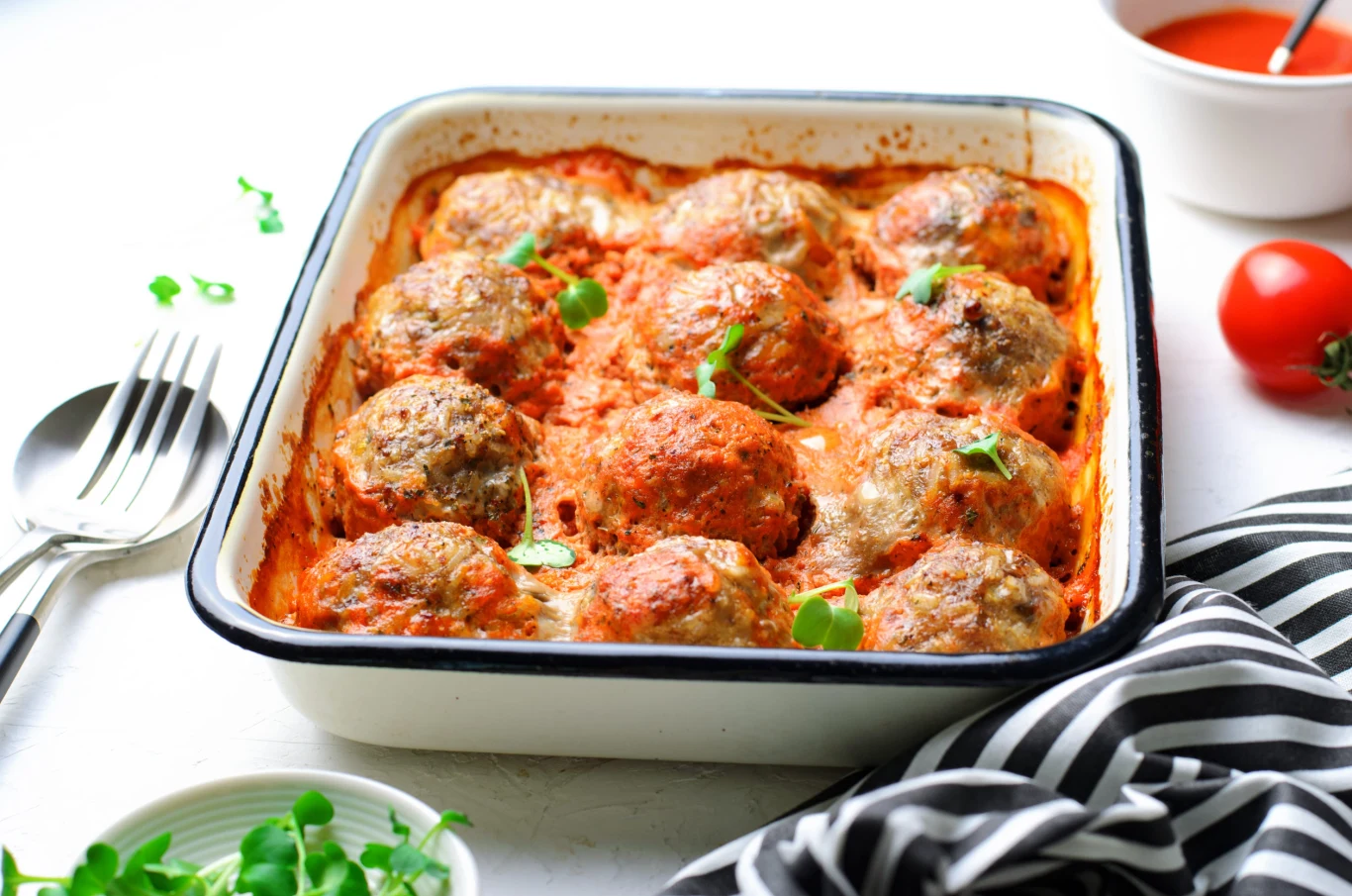 Zapiekane klopsiki w sosie pomidorowym to klasyczny, domowy obiad, który właściwie robi się sam. Nie musisz pilnować gotującego się mięsa. Aromatyczny czosnek, majeranek i bazylia sprawiają, że danie pachnie bardzo domowo i apetycznie już podczas pieczenia.
