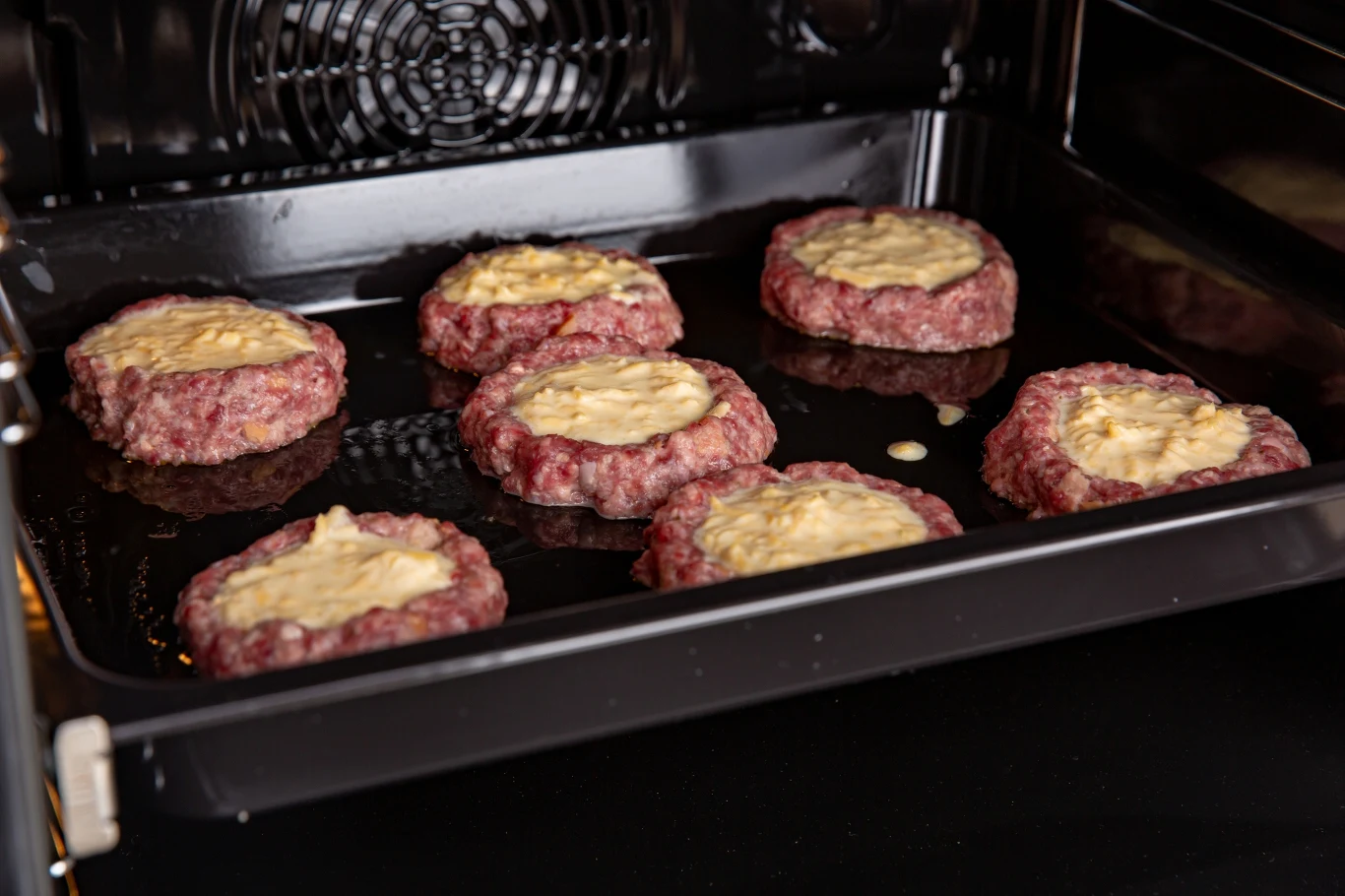 Blachę piekarnika wyściel papierem do pieczenia. Z mięsa uformuj równej wielkości kotlety, ułóż je na blasze w równych dostępach. Za pomocą szklanki rozgnieć kotlety, robiąc w nich delikatne wgłębienie. W to zagłębienie wkładaj łyżką farsz.